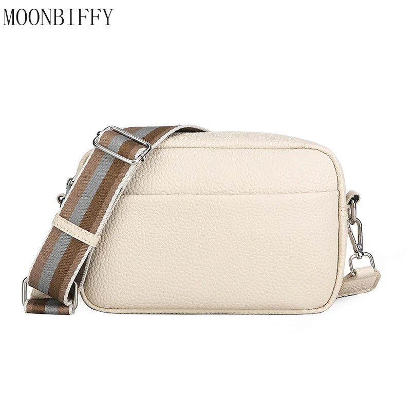 Elegant and practical crossbody bag with wide fabric strap, made of high-quality PU leather. Perfect for daily use with a secure zipper closure.