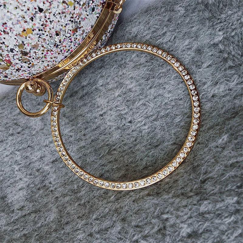 This evening clutch features a round ball-shaped design with colorful diamonds and crystals, perfect for adding a touch of glamour to your outfit.