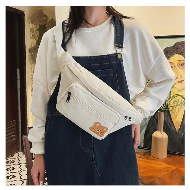 This messenger bag features a cute bear design and is made of soft corduroy material. It has a zipper pocket for secure storage and a phone bag for easy access.