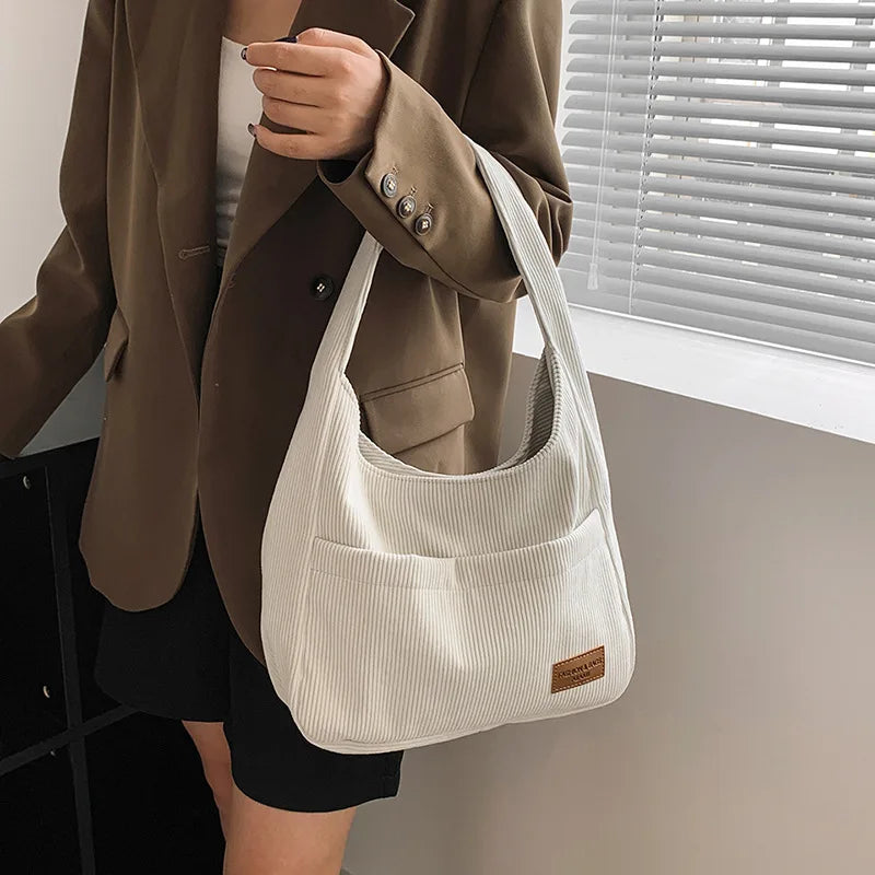 Corduroy Tote Bag for Women with Front Double Pocket Solid Girls Handbags