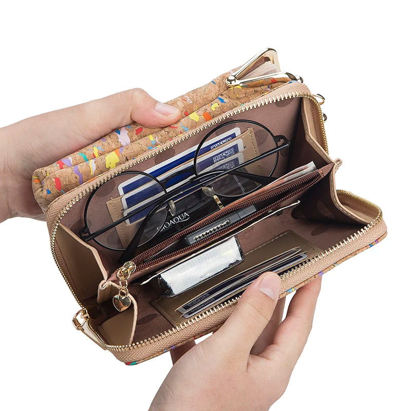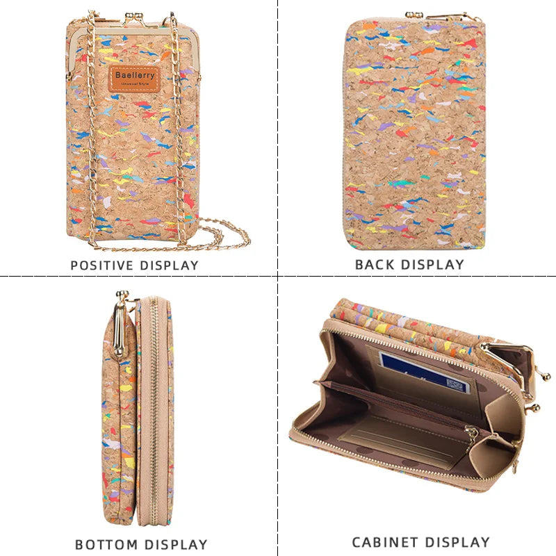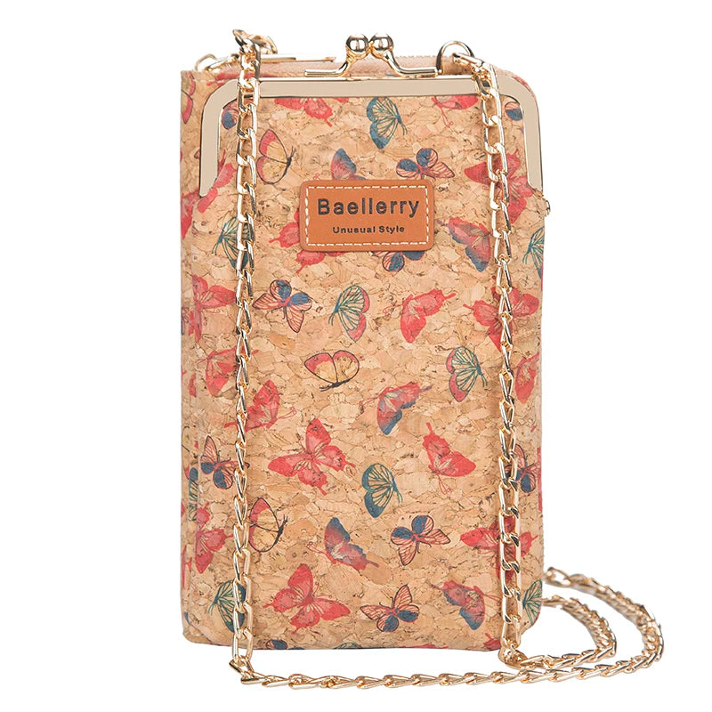 This small shoulder bag is perfect for women on-the-go. Made from high-quality cork material with a beautiful butterfly pattern, it includes a wallet chain and can be used as a phone clutch purse or handbag.
