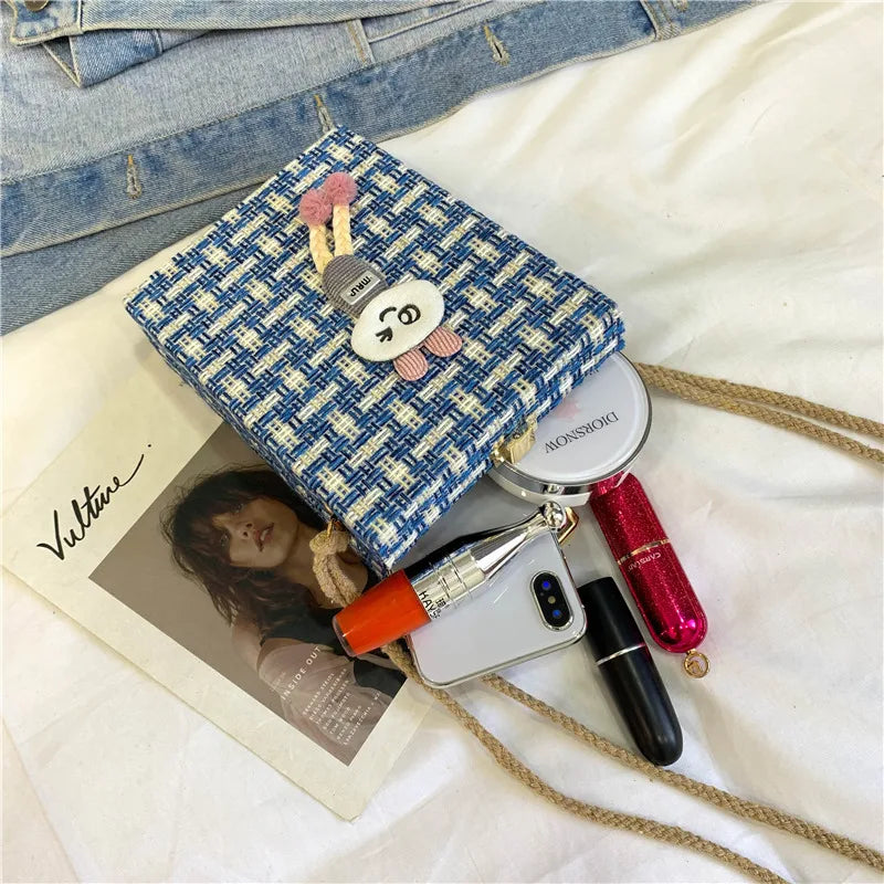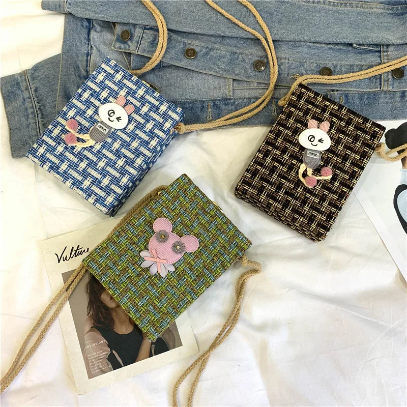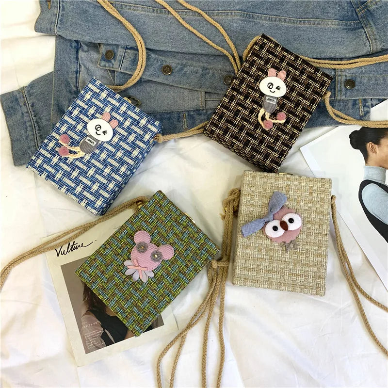 This square cartoon shoulder bag is perfect for girls and can also hold your mobile phone. Made from cotton and linen, this bag is both fashionable and functional.