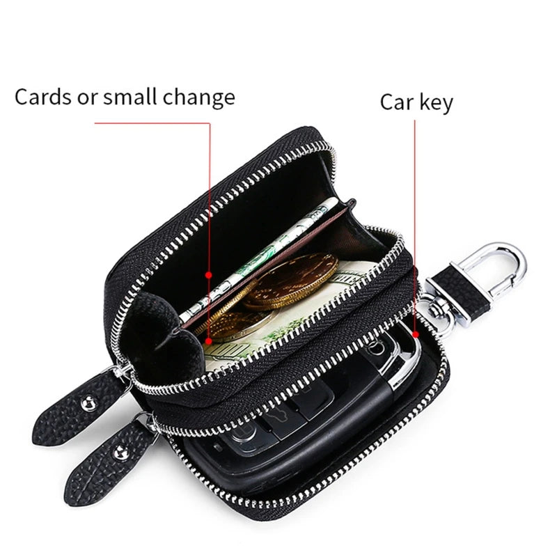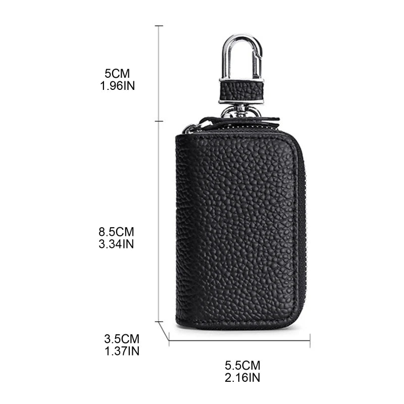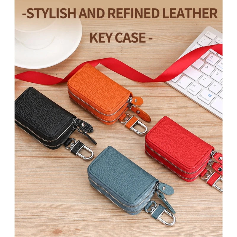 This stylish key holder is made of high-quality cow leather in earth yellow color. It features double pockets with zipper for secure storage.