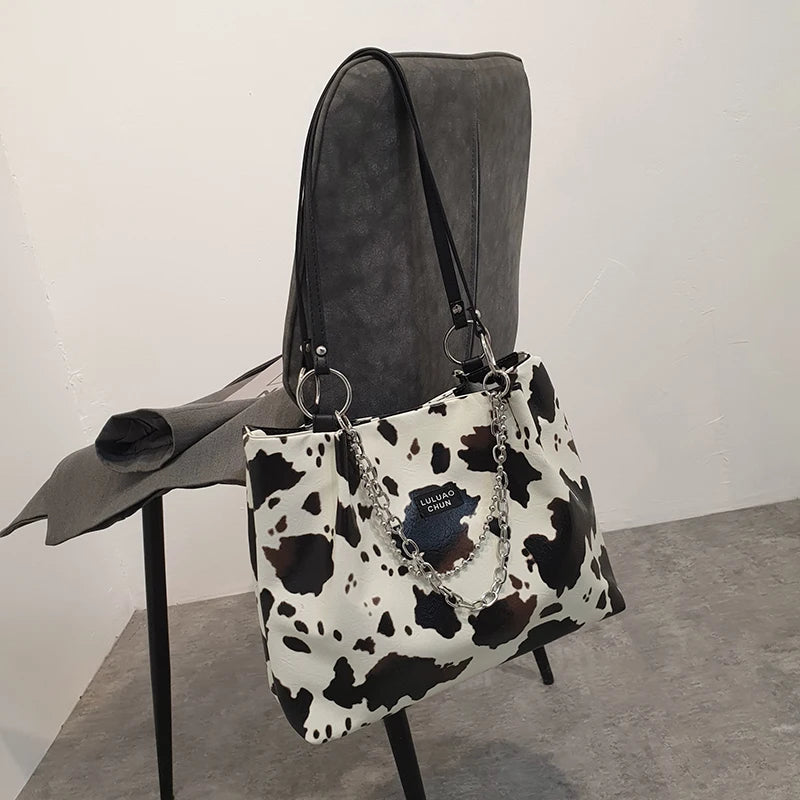 Stay stylish with this trendy cow pattern shoulder bag. Features a spacious design with chain straps for easy carrying.