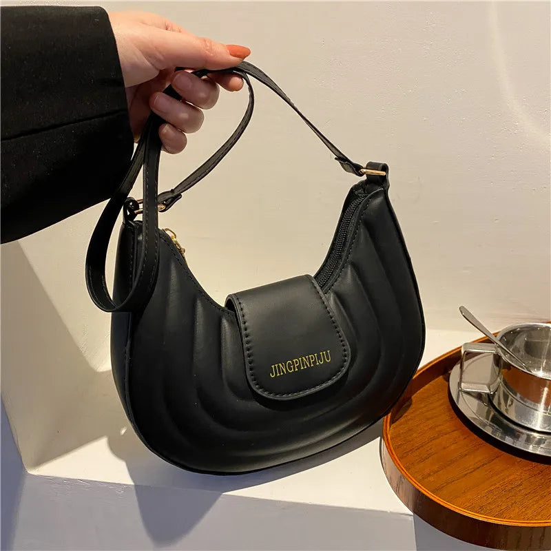 This stylish bag is made of PU leather and designed for women. It features a crescent pattern and half-round shape.
