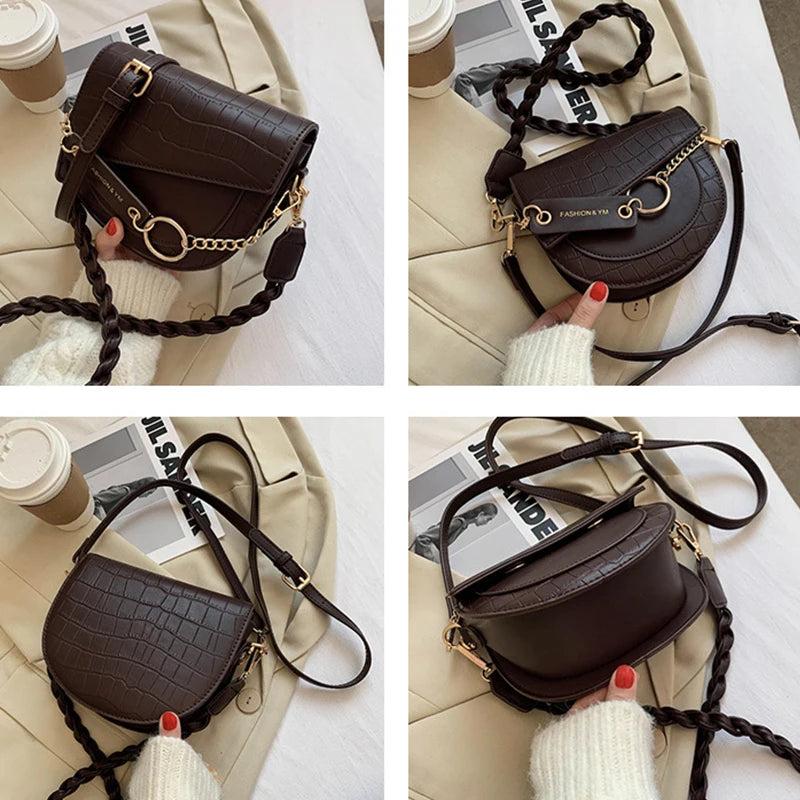 Elevate your style with this chic crocodile pattern saddle bag made of high-quality PU leather. Perfect for any occasion, this versatile handbag features a chain shoulder strap for added flair.