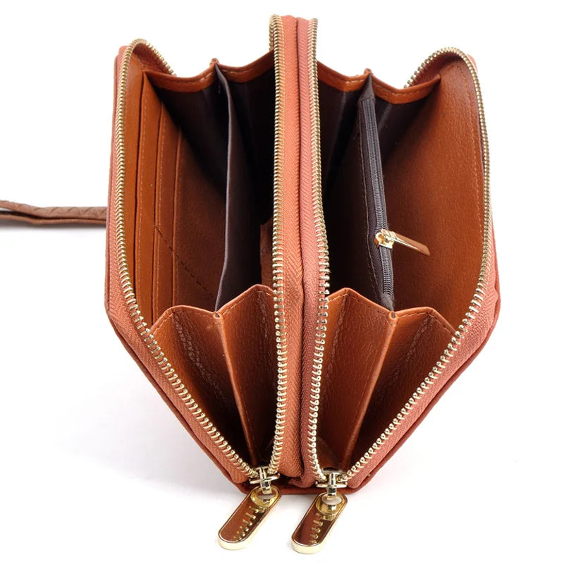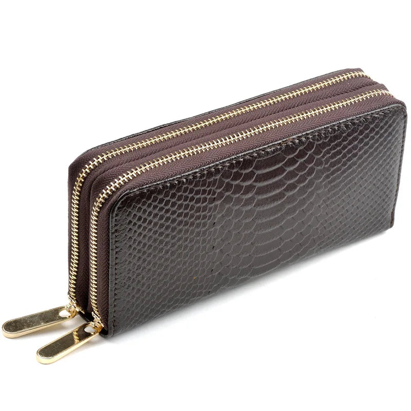 This stylish double zipper wallet handbag features a crocodile print design. Made from high-quality leather, it is perfect for men and women.