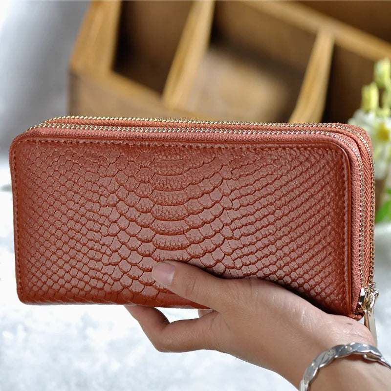 Crocodile Print Leather Double Zipper Wallet Handbag