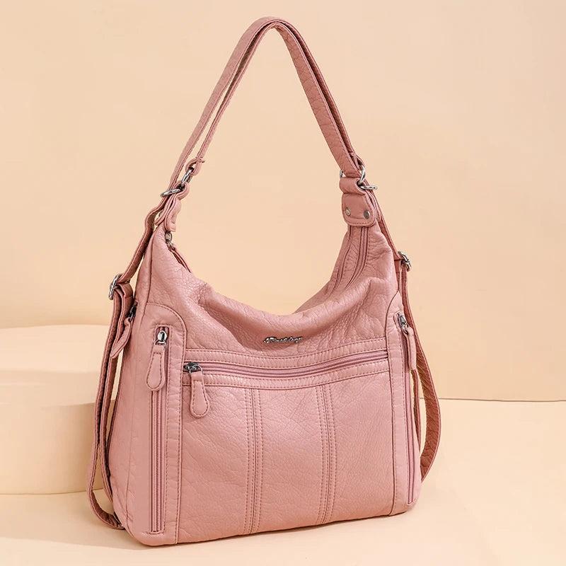 Stay organized and stylish with this large capacity women's handbag made of high-quality PU leather. Featuring multiple compartments, this multifunctional bag is perfect for daily use. The pink color adds a pop of fun to any outfit.