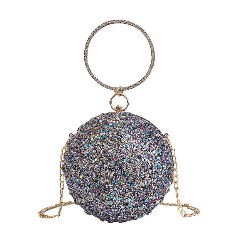 This colorful crystal diamonds clutch is perfect for evening events, weddings, and parties. It features a round ball shape and comes with a chain shoulder strap.