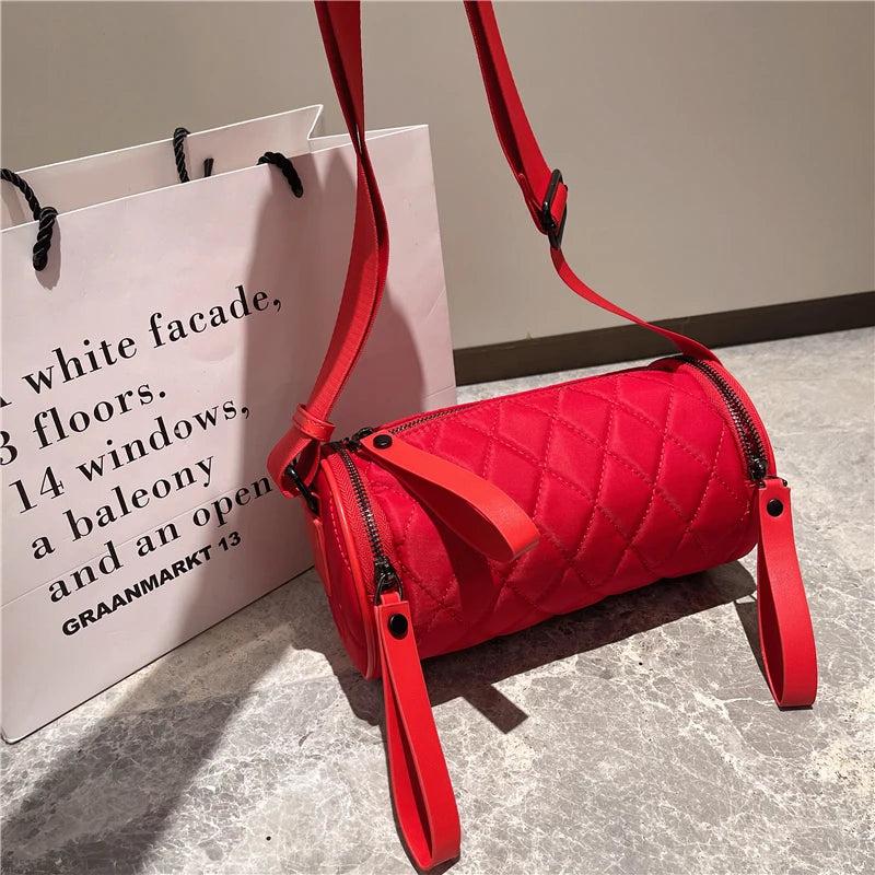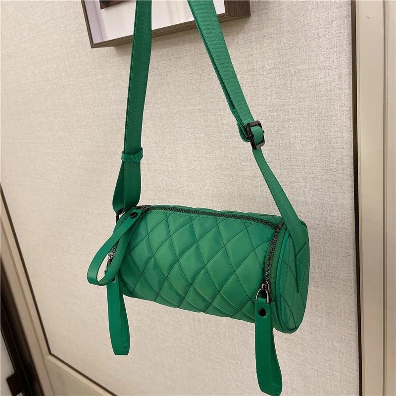 This stylish cylindrical crossbody bag for women features a lattice design and is made of durable nylon material. Perfect for daily use or special occasions.