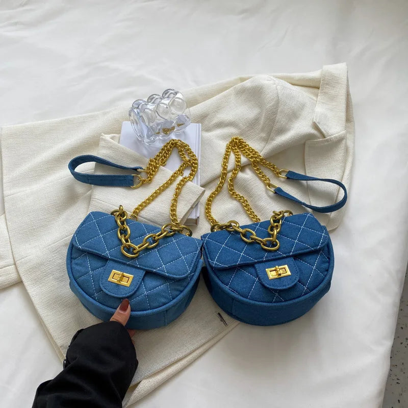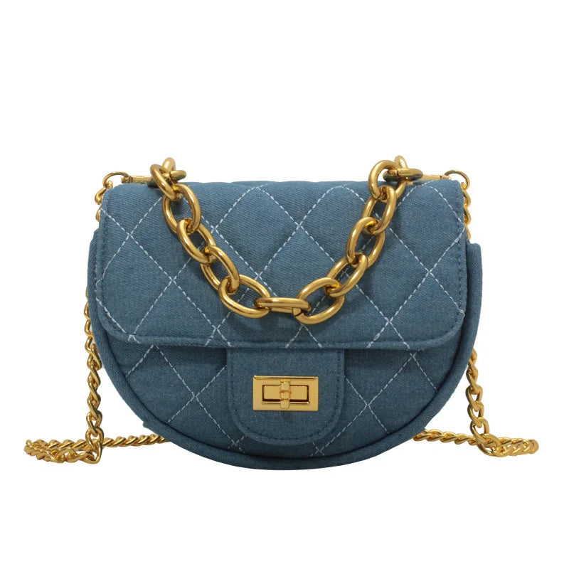 This small shoulder bag is perfect for everyday use. Made of durable denim canvas, it features a stylish chain strap and a saddle design.
