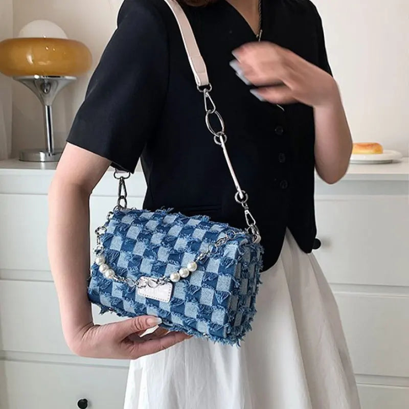 Denim Plaid Beading Shoulder Bags for Women Crossbody Bag Female