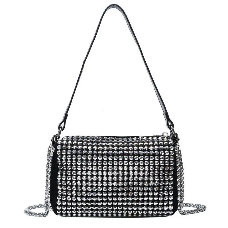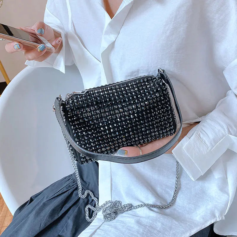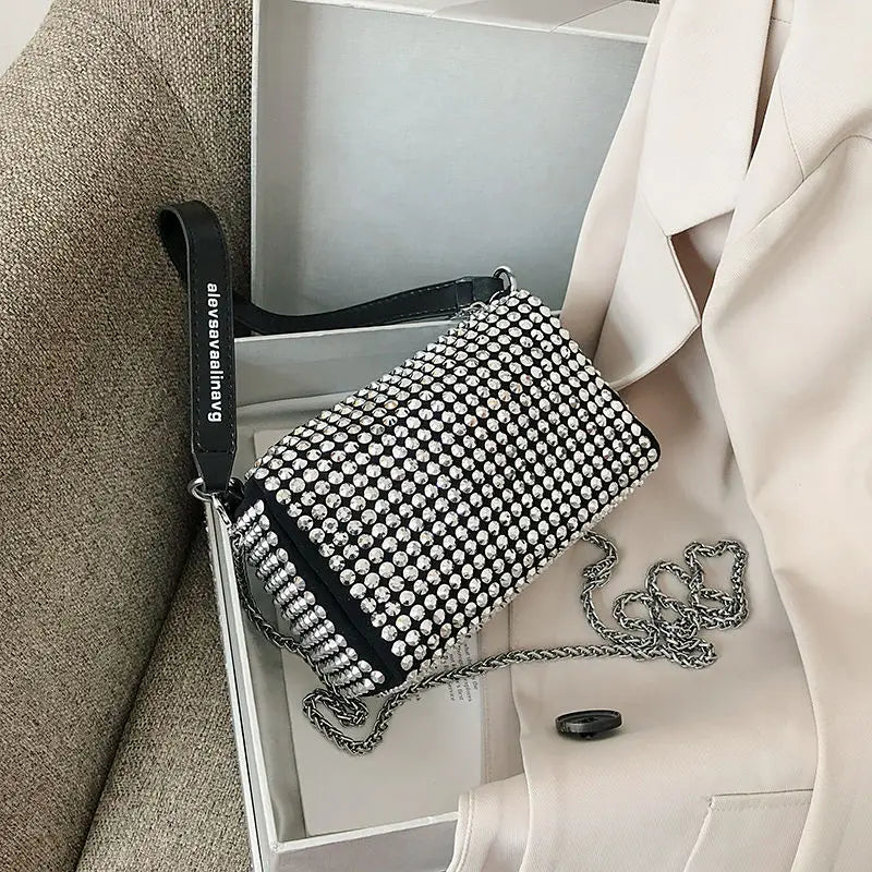 Elevate your style with this chic diamond-encrusted chain small square bag. Perfect for adding a touch of luxury to any outfit.