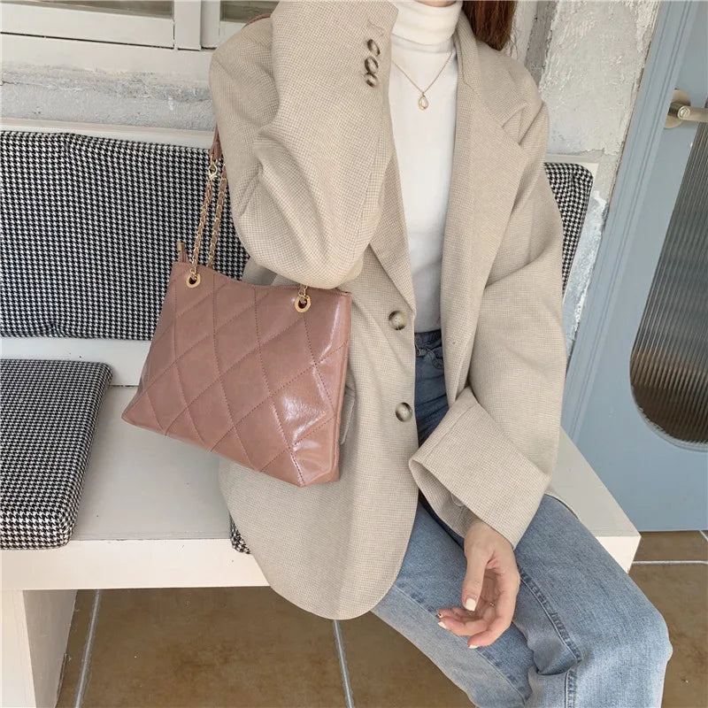Stay stylish with this chic leather shoulder bag featuring a diamond lattice pattern and chain strap. Perfect for daily use or nights out.