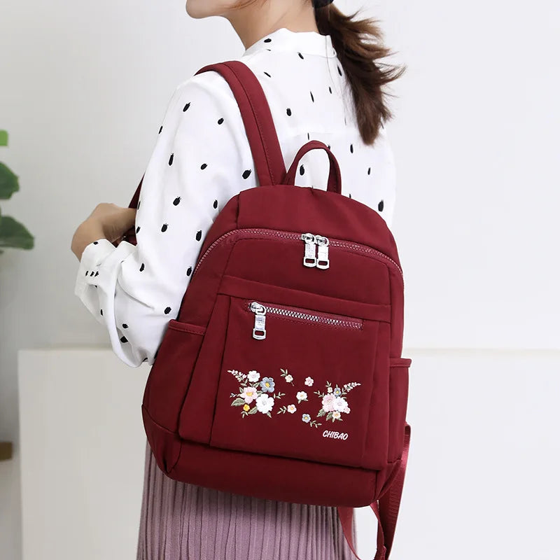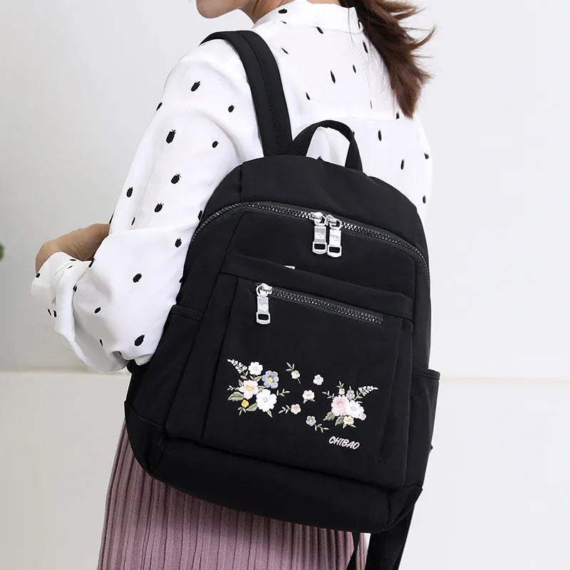 Stay stylish and organized with this waterproof nylon backpack featuring intricate embroidery. Ideal for school, travel, or daily use.