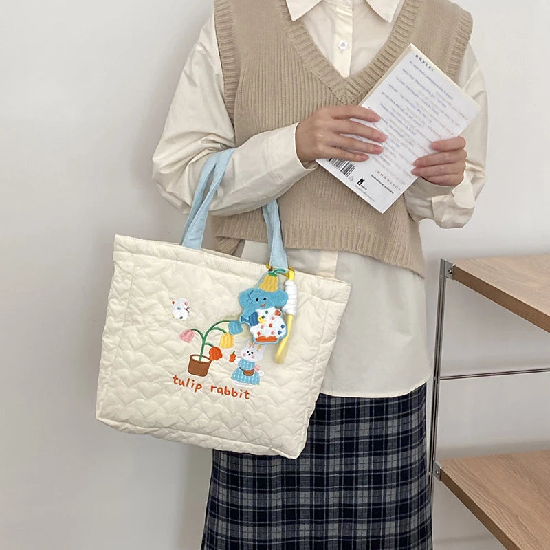 This adorable shoulder bag features an embroidered rabbit design with quilted details. It offers a large capacity for all your essentials, making it perfect for shopping or school. The sweet and charming look of this bag is sure to make you stand out.