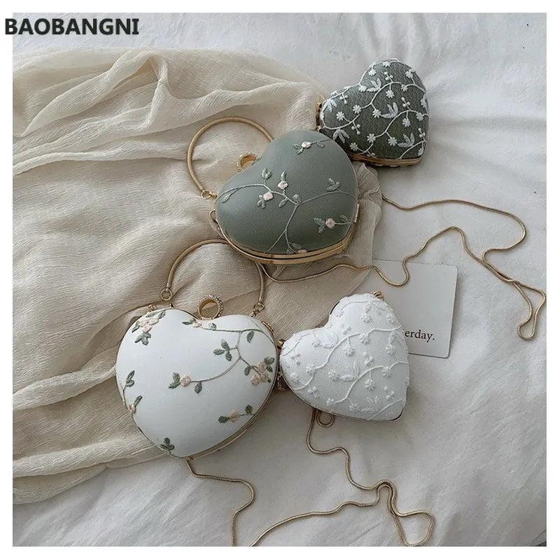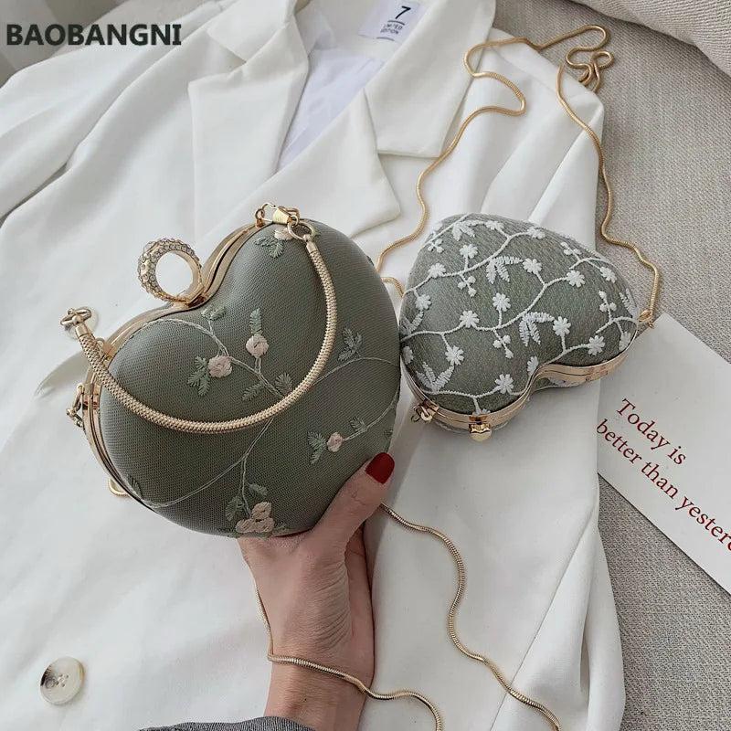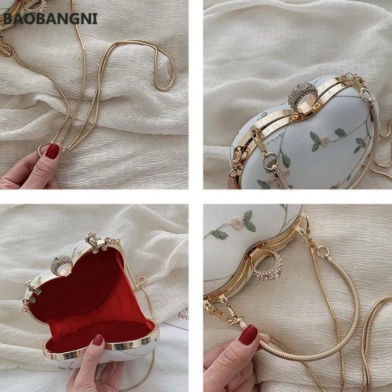 Elegant and stylish heart-shaped clutch bag with embroidered flowers. Perfect for evening events and parties. Features a chain shoulder strap for versatile wear.