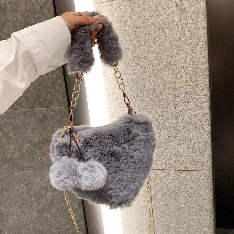 This heart-shaped handbag is made of soft faux fur, perfect for adding a touch of fun to your outfit. It features a chain shoulder strap for easy carrying and a spacious interior for your essentials.