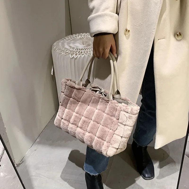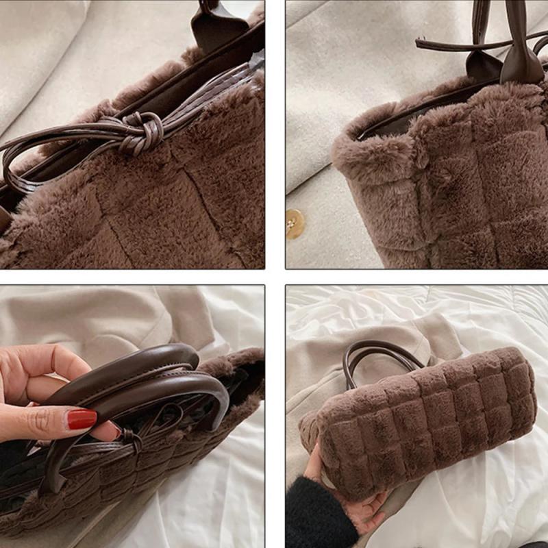 Upgrade your style with this trendy plaid shoulder bag featuring faux fur accents. Perfect for adding a touch of sophistication to any outfit.