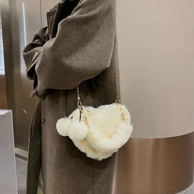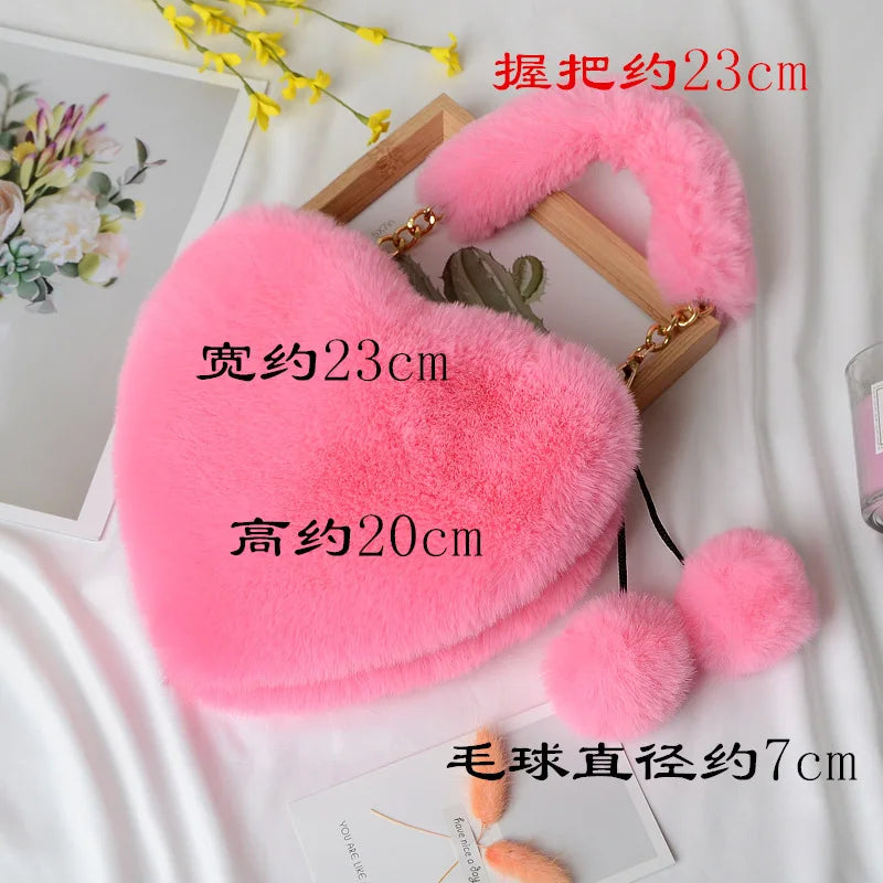 Faux Fur Winter Women Handbags Plush Ladies Heart Shaped Shoulder Bag