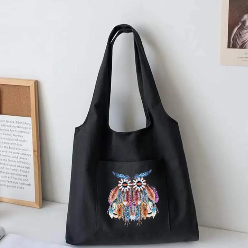 Feather Print Canvas Tote Bag Large Capacity Shoulder Handbag