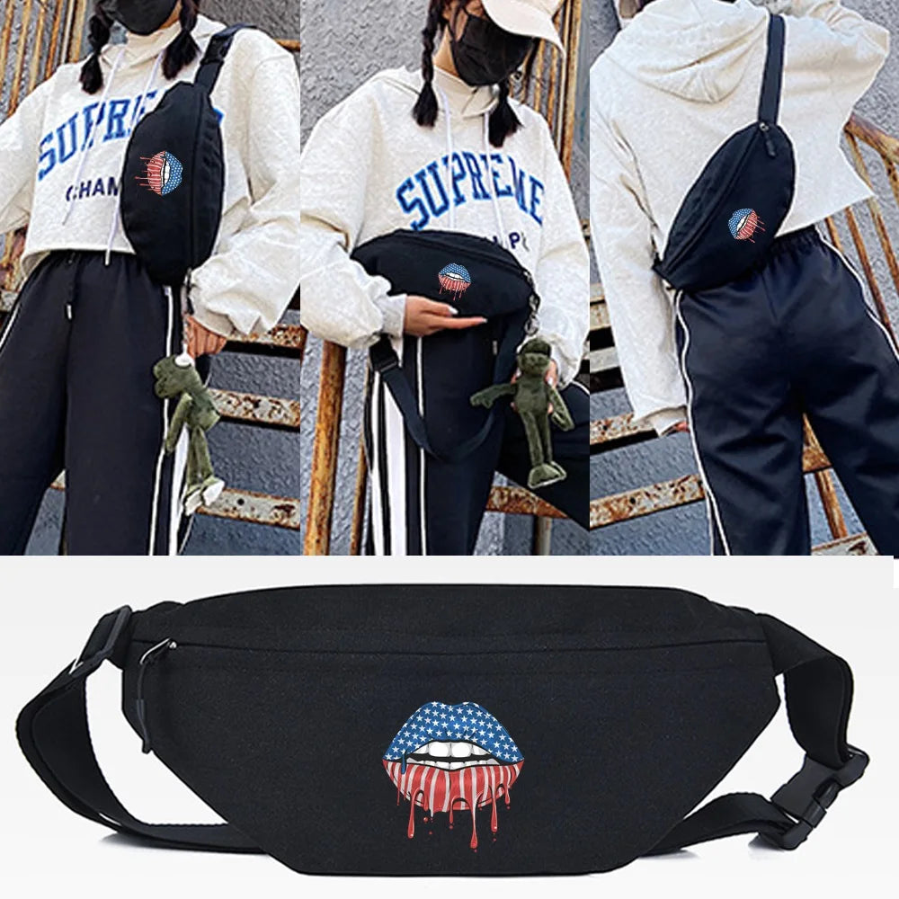 Flag Lip Print Chest Pack Large Phone Bag Pouch Women Canvas Travel Fanny Bag