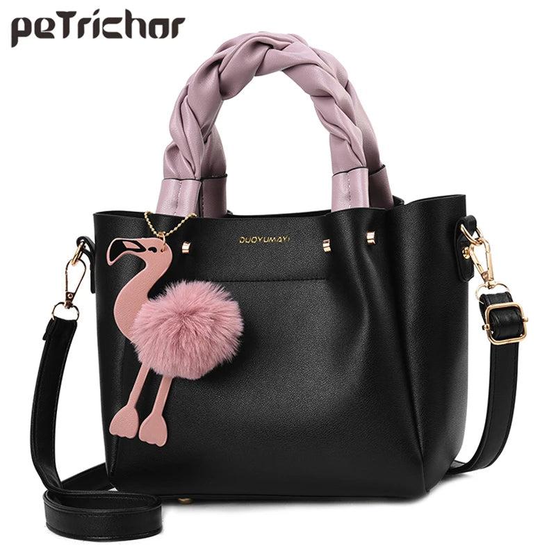 This stylish Flamingo Women Shoulder Bag is made of high-quality leather, featuring a braid handle design. It can be used as a crossbody or tote bag, perfect for any occasion.