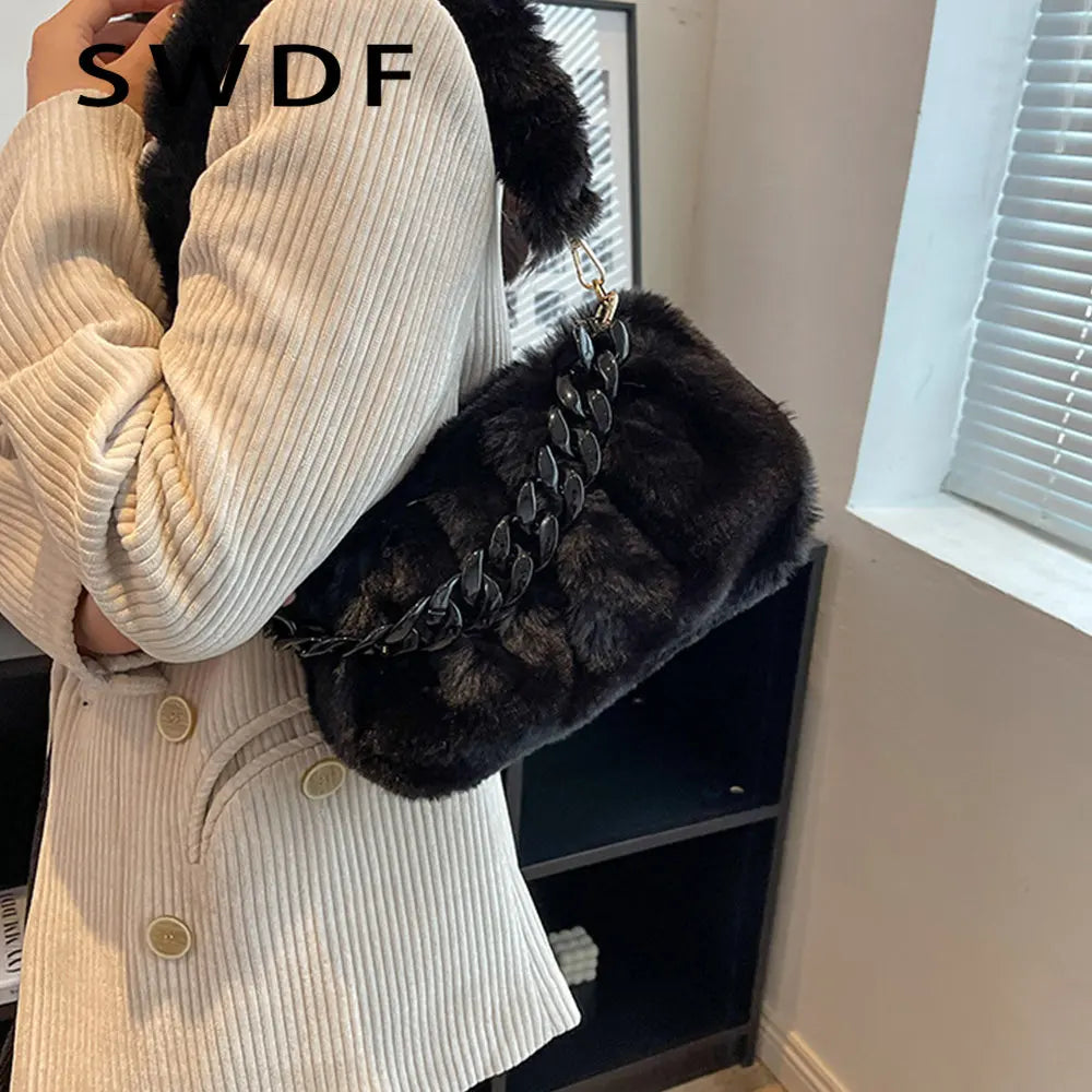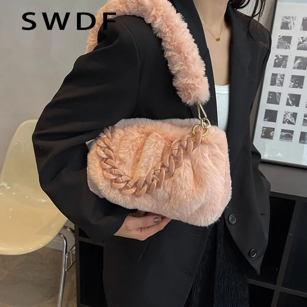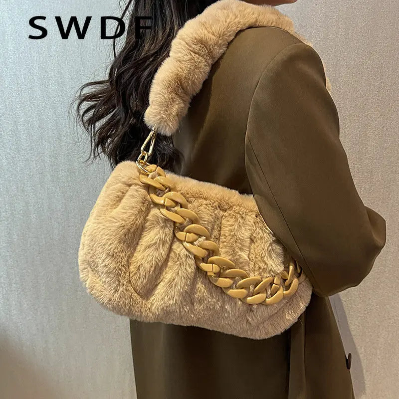Fluffy Plush Women Shoulder Bag with Acrylic Chains Crossbody Bags