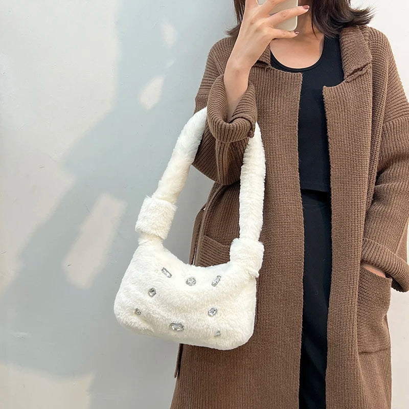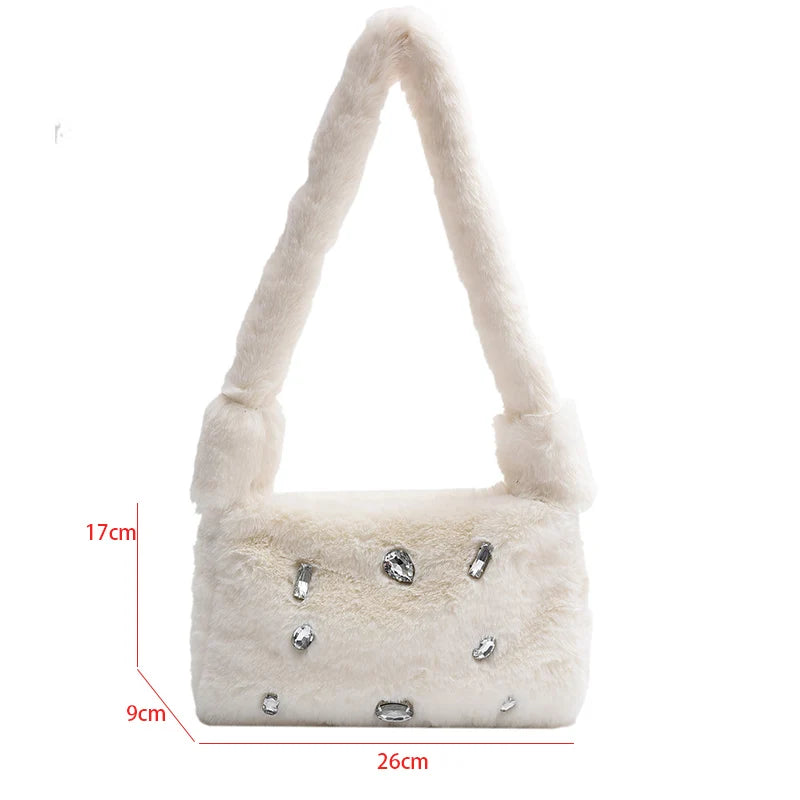 Fluffy Shoulder Tote Bag Faux Fur Stud Diamonds Small Purse