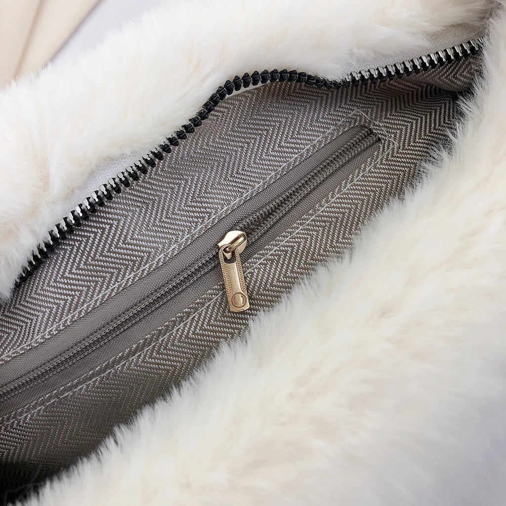Stay stylish and cozy with this lamb-like fabric shoulder tote bag that features a fluffy plush design. The faux fur studded diamonds add a touch of sophistication to this small purse, making it the perfect accessory for any outfit.