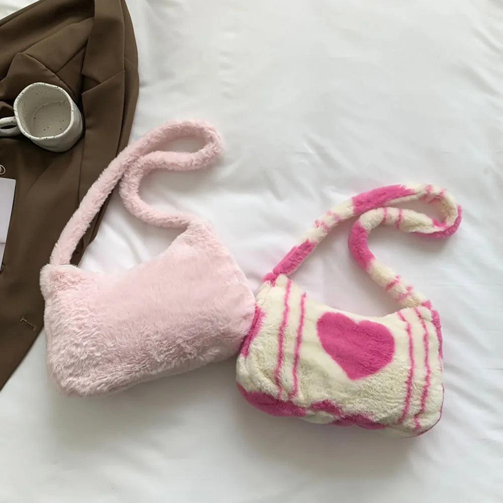 Fluffy Women Shoulder Bag Love Heart Printed Tote Bag