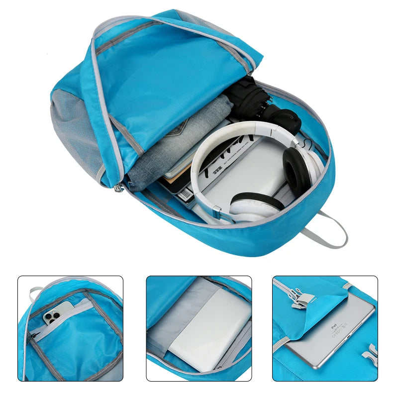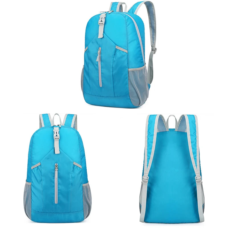 This lightweight backpack is made of waterproof Oxford fabric, perfect for outdoor activities. It can be easily folded for storage when not in use.