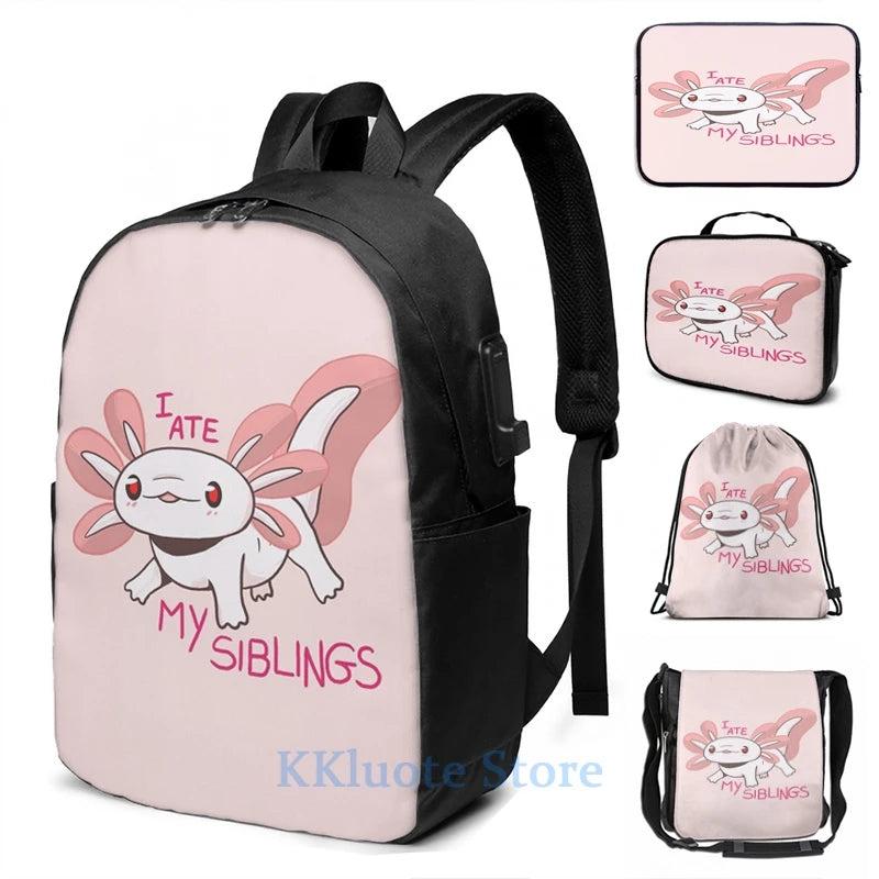 This backpack features a cute axolotl baby graphic print and offers USB charging capability for convenience. Perfect for school, work, or travel.