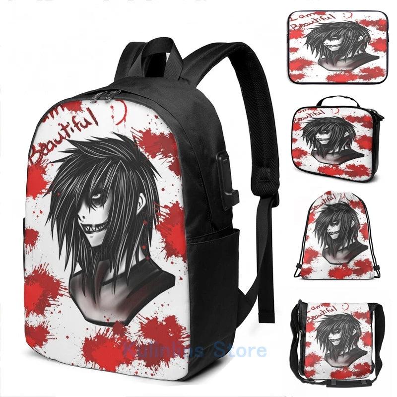 This backpack features a humorous graphic print of Jeff the Killer. It comes with USB charging capability, making it ideal for school, travel, or work. Perfect for men and women.