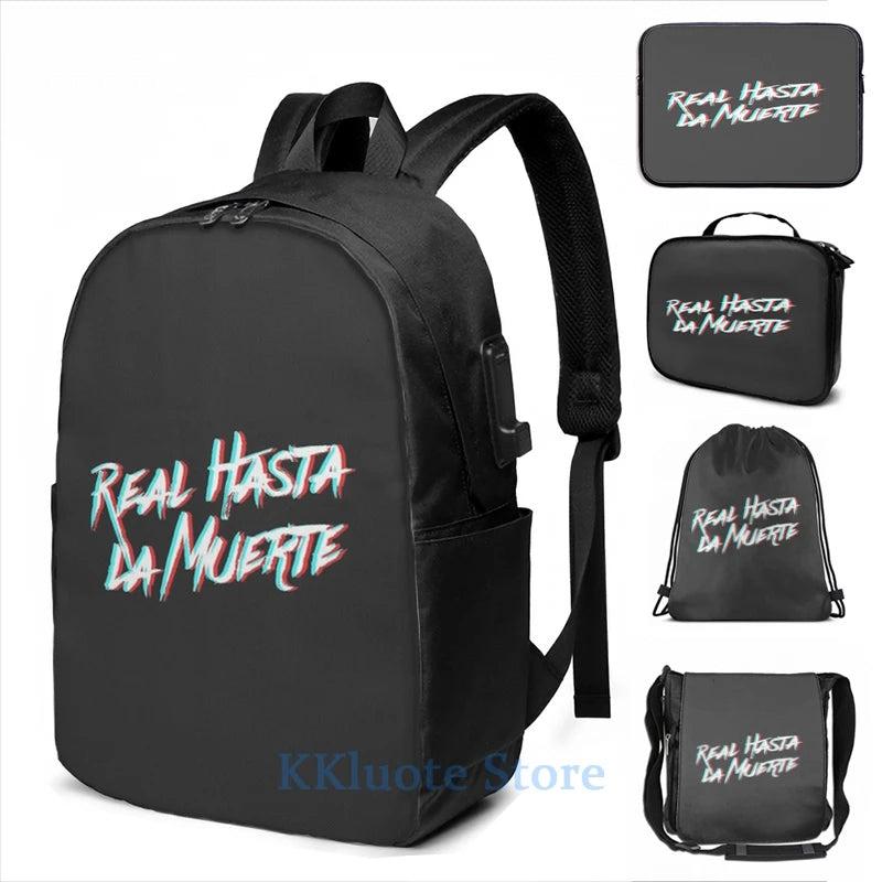 This stylish backpack features a humorous design with Anuel aa- real until death graphics. It also includes a USB charging port for your convenience.