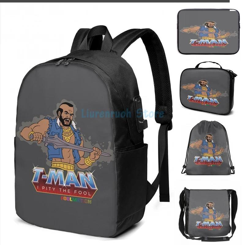 This backpack features a humorous graphic print of T-Man and comes with a USB charging port. It's perfect for school, travel, or carrying your laptop.