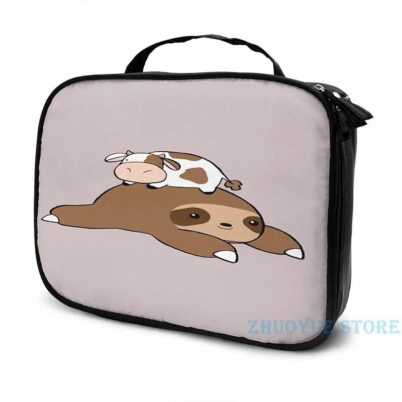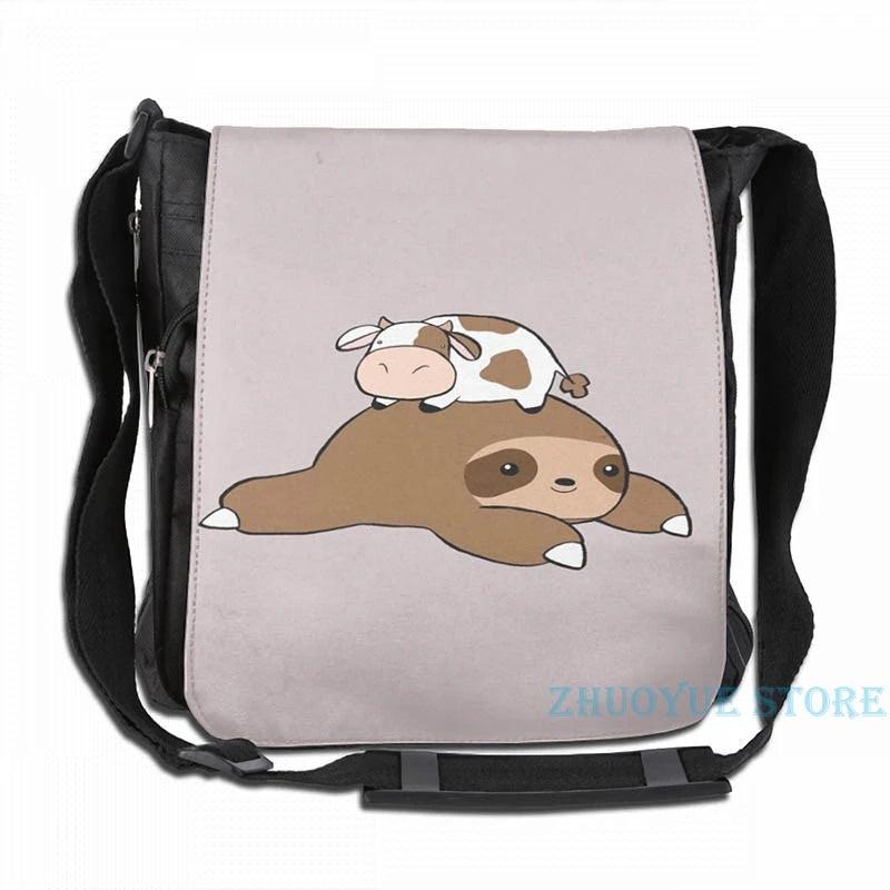 This USB charge backpack features a hilarious graphic print of a sloth and tiny cow, perfect for men and women. Ideal for school, travel, or work, this bag offers ample storage and a convenient USB charging port.