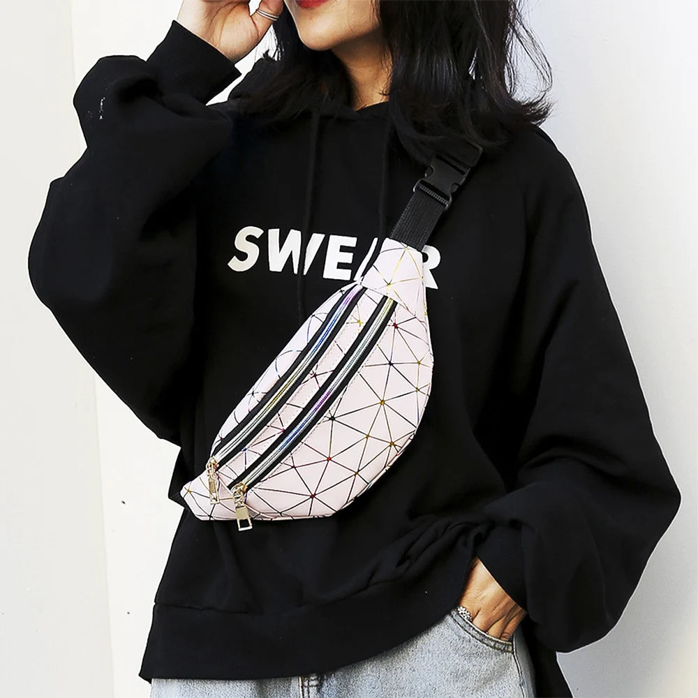 Stay trendy with this holographic waist bag for women. It features a geometric design and can also be used as a chest phone pouch.