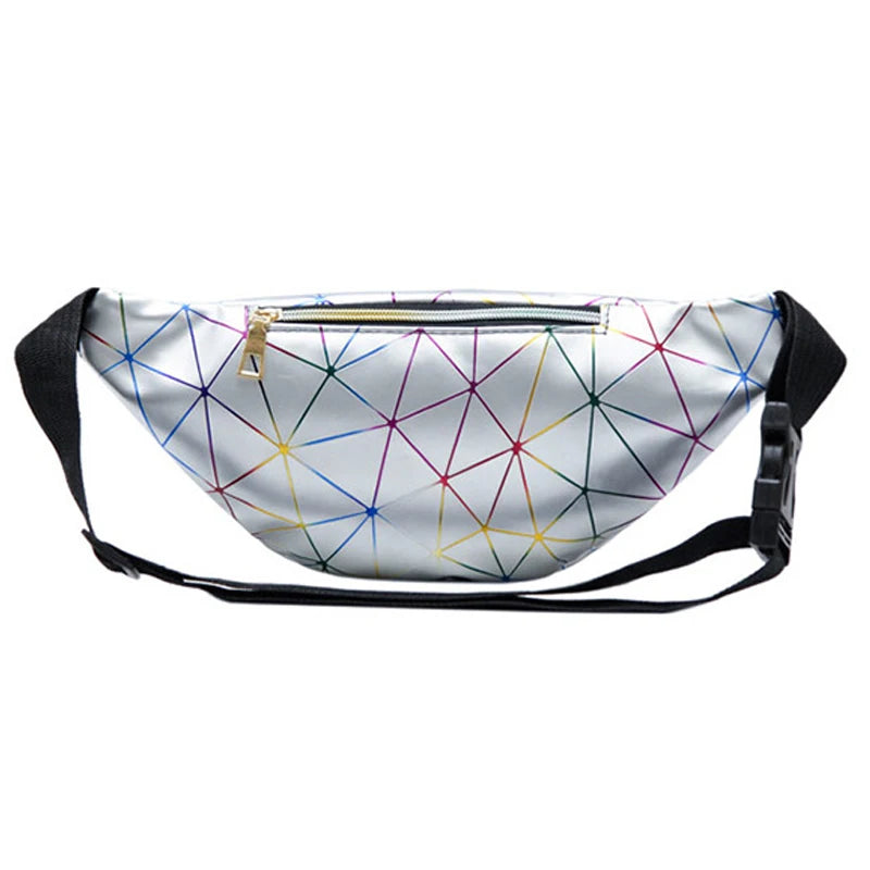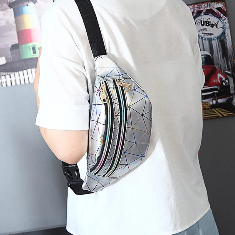 This waist bag features a laser geometric pattern design with PU artificial leather splicing, suitable for both men and women. It serves as a convenient chest phone pouch and purse for on-the-go use.