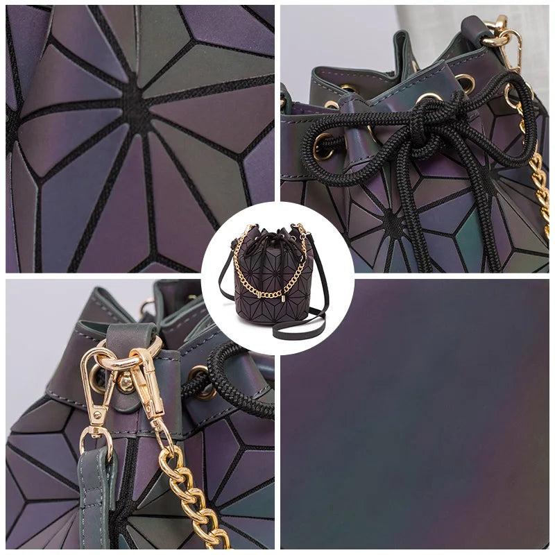 This stylish bucket bag features a reflective geometric design that shines and changes colors. Perfect for girls and women looking to make a statement.