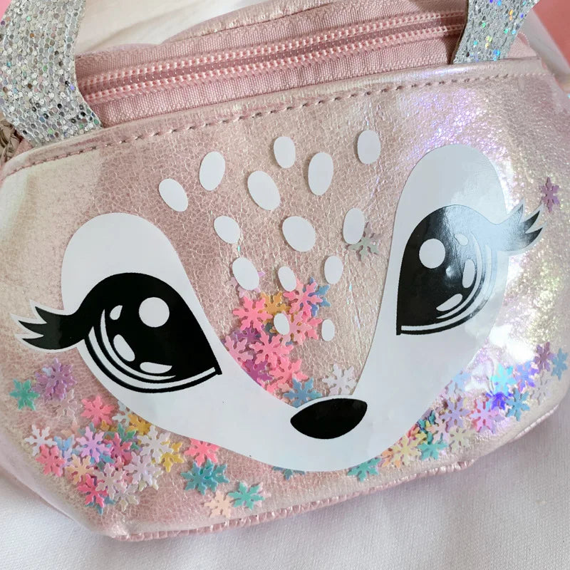 This adorable waist bag features cartoon sequins design with a small deer, made of waterproof PVC material. It can be worn as a belt bag or crossbody style for versatile use.