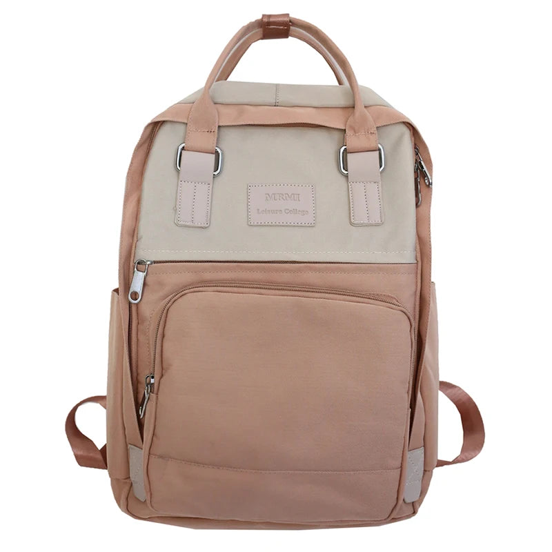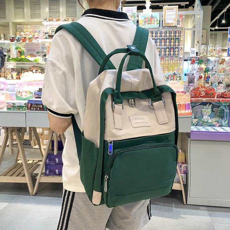 This large capacity backpack is perfect for teenage girls. It features a ring buckle, waterproof nylon material, and a colorblock design.