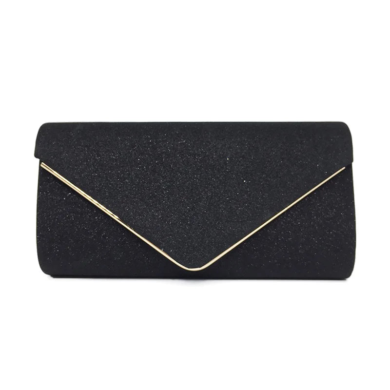 This glittery envelope clutch is perfect for weddings or special events. It features a chain shoulder strap for easy carrying.