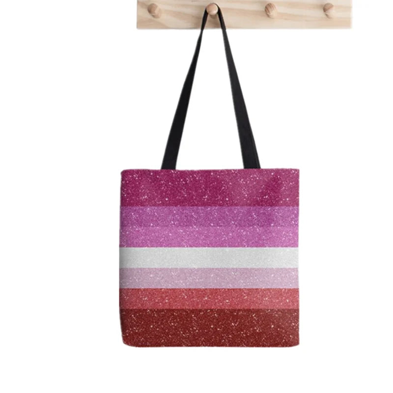 Elevate your style with this fashionable glitter lipstick lesbian printed tote bag. Perfect for shopping or a day out, this canvas shoulder bag is a must-have for any fashion-forward woman.
