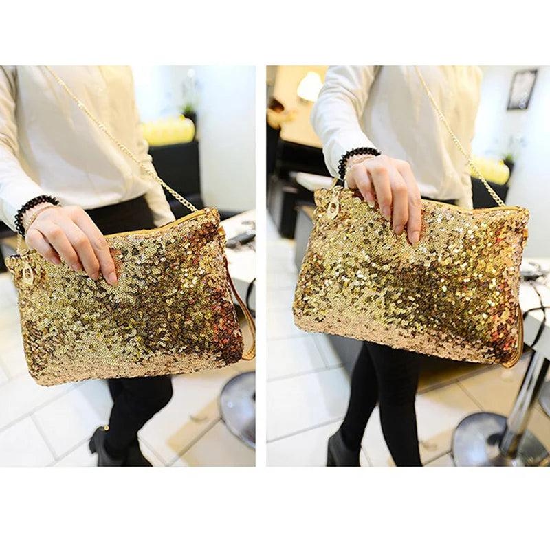 Shimmer and shine at parties with this sparkling sequins handbag. Perfect for evening events, this envelope clutch bag is a stylish accessory to carry your essentials in.