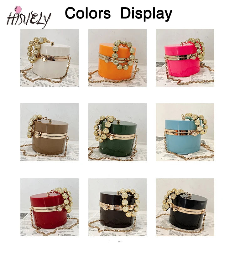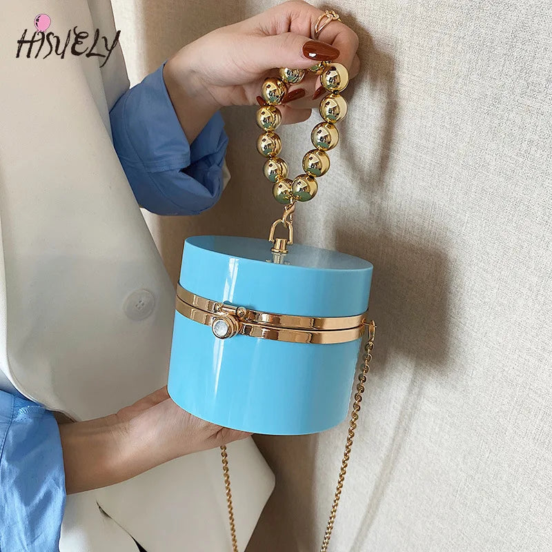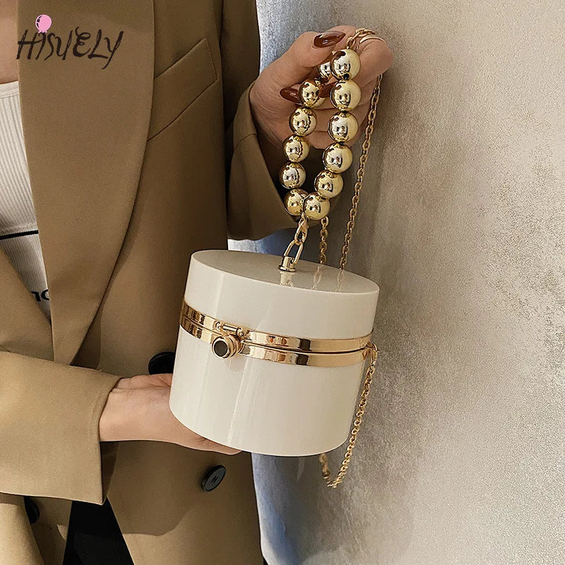 Golden Beaded Handle Acrylic Round Clutch Bag for Women