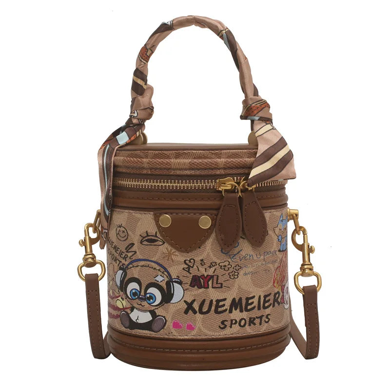 This stylish cylindrical bag is made of high-quality PU leather, great for everyday use. It features a graffiti design, suitable for women of all ages.