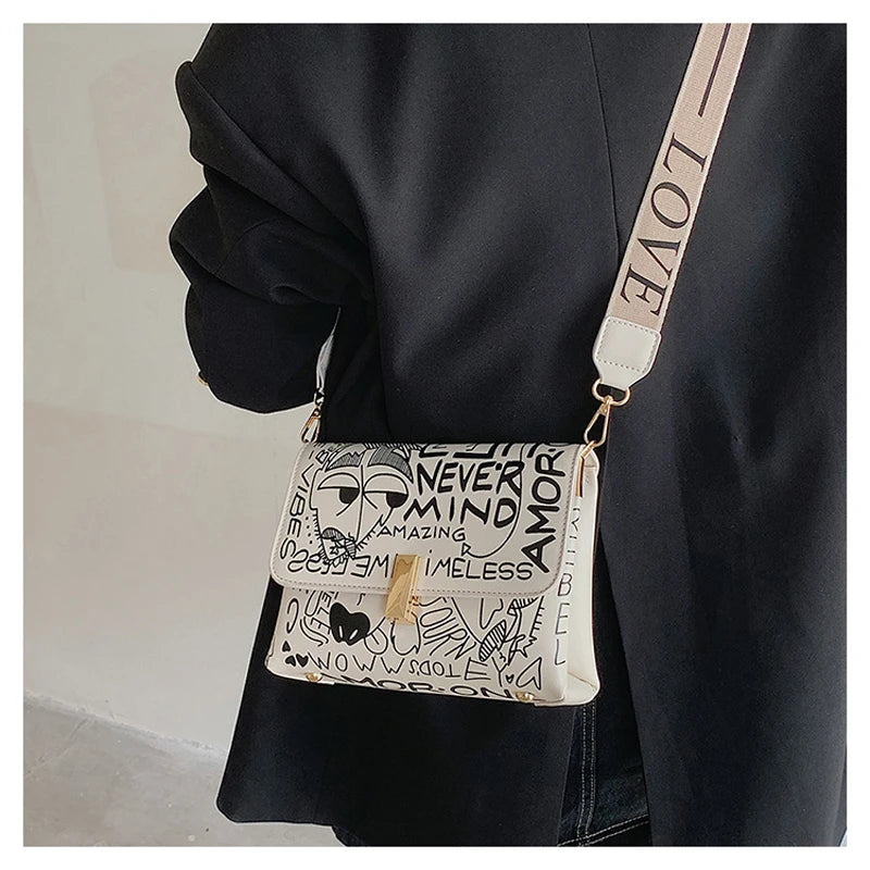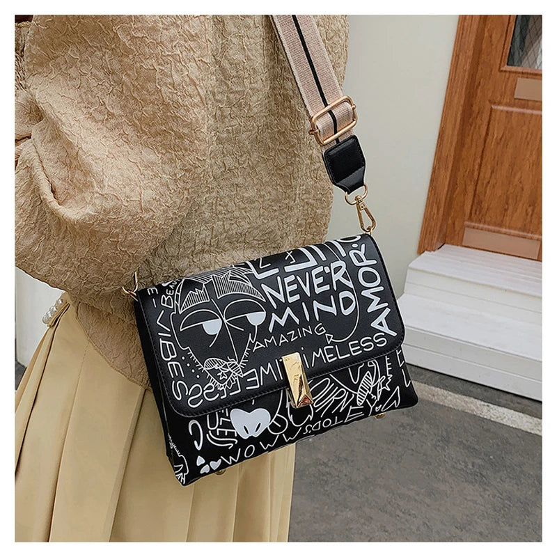 This versatile small square bag features a unique graffiti design, perfect for the stylish girl on the go.