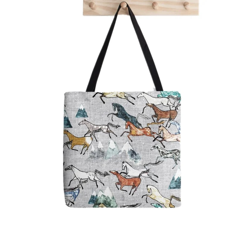 Gray Running Horses Pattern Bag Harajuku Shopping Canvas Shopper Tote Shoulder L